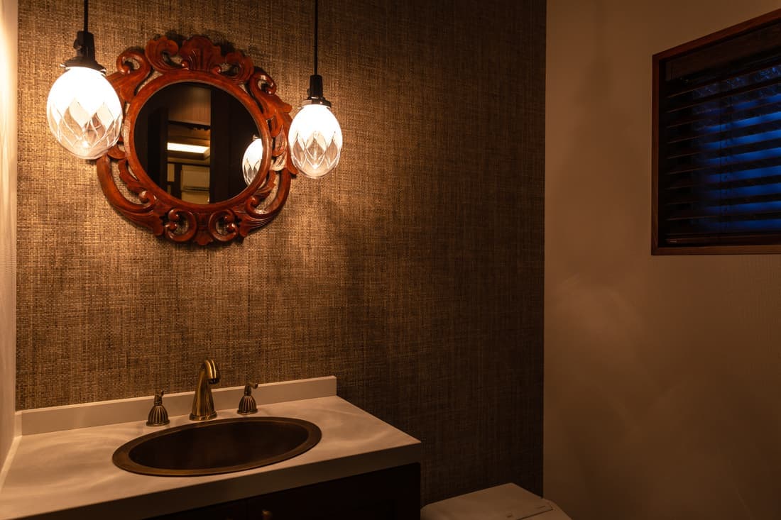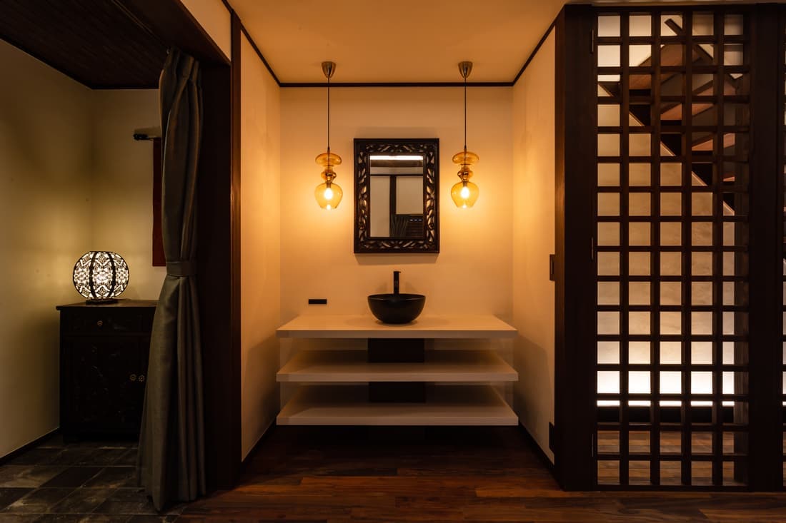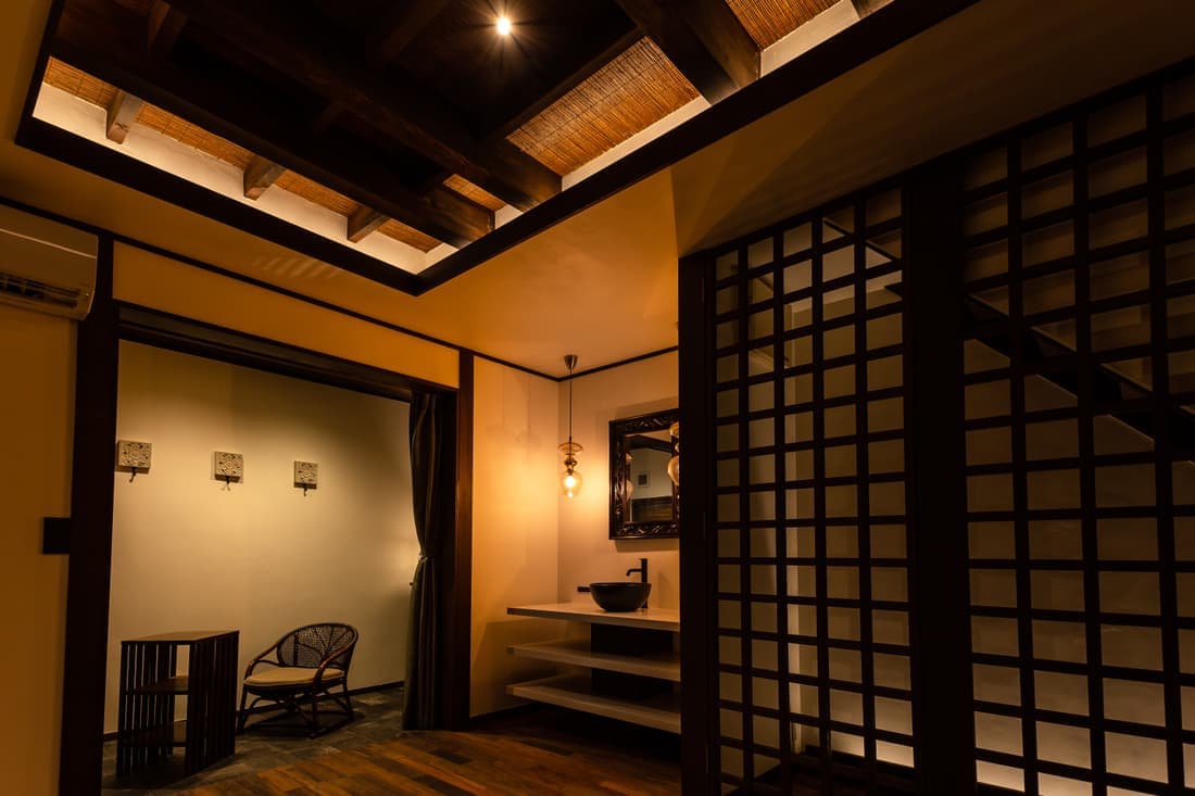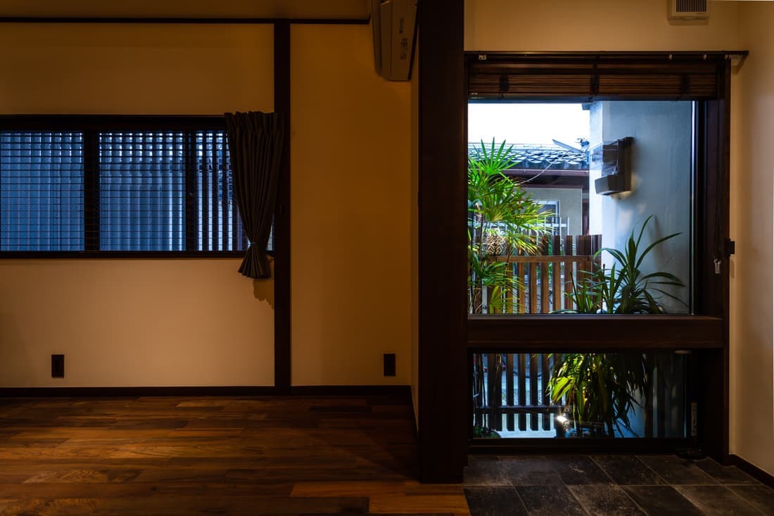 外観は路地奥の環境になじむよう京町家の雰囲気をつくりあげ、一転内装は建具や造作に至るまでバリテイストで統一してあります。